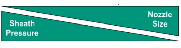 - Las condiciones dela separación tamaño del nozzle y presión, van de la mano en la mayoría de las ocasiones. Aunque también pueden cambiar dependiendo del instrumento y la configuración deseada.