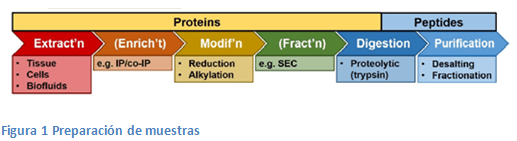 Primero, las muestras biológicas se preparan a través de un flujo de trabajo ascendente, en el que las proteínas se extraen de las células y se digieren enzimáticamente en péptidos. Los péptidos posteriormente se analizaran por LC-MS/MS.
