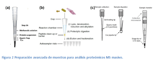 S-Trap: Suspensión trapping. Permite la limpieza, digestión y fraccionamiento de péptidos dentro de un solo dispositivo (Figura 2a). El dispositivo S-Trap está diseñado para un flujo de trabajo basado en la centrifugación y está compuesto por un filtro de cuarzo para atrapar proteínas intactas seguido de un tapón monolítico C18 (fase reversa) en el que se retienen los péptidos y se realiza la desalinización y / o fraccionamiento de la muestra.