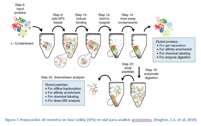 SP3: Single pot solid phase-enhanced simple preparation. Basado en el enfoque clásico de preparación de muestra en vial. Se utilizan bolitas mágneticas derivatizadas con grupos funcionales hidrofílicos (Figura 3). Este enfoque permite el enriquecimiento de proteínas, la eliminación de detergente y la digestión disolución al agregar las bolitas directamente en el lisado celular.