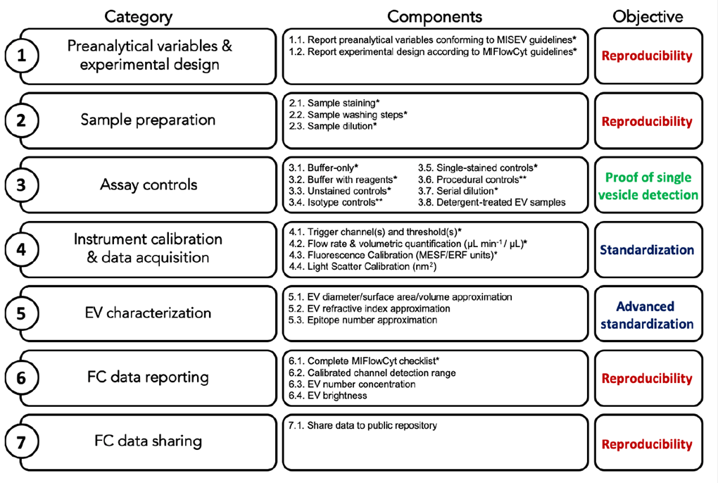 Fruto del trabajo conjunto de la ISEV y de la Sociedad Internacional para el Avance de la Citometría (ISAC), se ha publicado una guía más específica para los estudios que utilicen la Citometría de Flujo (CITF) como el método de elección para la caracterización fenotípica de EVs y su identificación y uso como biomarcadores: