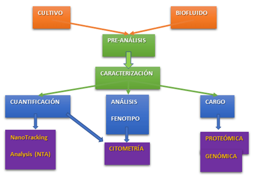 Por tanto, el estudio de las EVs va a incluir tanto la caracterización de las mismas en cuanto a nº de partículas, fenotipo, presencia en condiciones normales o patológicas, etc, así como la caracterización de su cargo específico mediante identificación de RNAs y/o estudios proteómicos.
