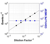 - DILUCIONES SERIADAS: Estos controles de diferentes diluciones van a servir para asegurarse de que estamos analizando partículas únicas à Hay que hacer diluciones seriadas y representar el factor de dilución contra el total del nº de eventos adquiridos y la intensidad de fluorescencia y/o la dispersión de luz para demostrar que maximizamos la detección de EVs individuales. Si observamos que disminuye el nº de eventos con la dilución pero no encontramos disminución en la intensidad de fluorescencia, estamos detectando partículas individuales.