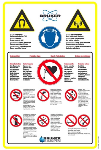 En la entrada a la sala del imán se colocarán señales informativas de los riesgos y precauciones que supone trabajar con campos magnéticos altos. Estos carteles son suministrados por Bruker y en ellos se informa de la entrada a una zona con un alto campo magnético y con alto nivel de ruido, la entrada restringida a determinadas personas, y objetos que no se pueden introducir.