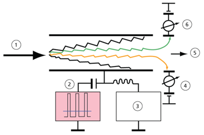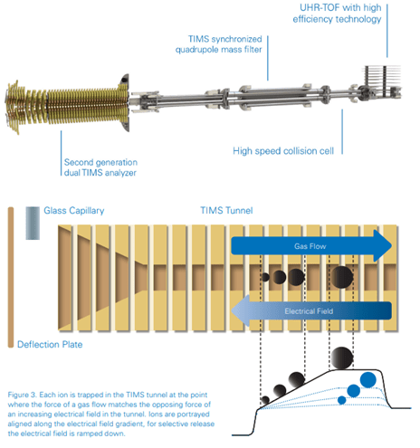 Los iones son impulsados a través del tubo TIMS con un flujo de gas. Un campo eléctrico controla que cada ion se mueva más allá de una posición definida por la movilidad del ion, donde el empuje que experimenta del flujo de gas coincide con la fuerza del campo eléctrico. Una rampa descendente del campo eléctrico permite la liberación selectiva de iones del tubo según su movilidad.