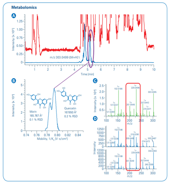 A- Dos isómeros de pentahidroxyflavonas (Quercetin y Morin) no pueden distinguirse por espectrometría de masas solamente ya que coeluyen en columna cromatográfica. Los datos muestran el pico base cromatográfico de un extracto de propolis (trazo rojo) y el cromatograma de extracción del ión m/z 303.0499 (trazo azul). B- Su diferencia en el patrón conformacional puede ser diferenciada en la dimensión adicional de movilidad. C/D- Una fragmentación subsecuente da un espectro limpio MS/MS de los compuestos. C- Mezcla MS/MS. D- Espectros MS/MS limpios.