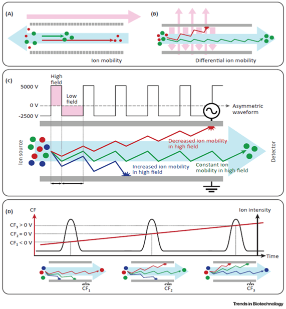 (A) En la espectrometría de movilidad iónica tradicional, los iones son impulsados por un campo eléctrico (flecha rosa) a través de un gas (flecha azul), y la separación se basa en las secciones transversales de colisión (CCS) de los iones, la masa, y la carga. (B) En DMS, los iones son transportados por un gas (flecha azul) entre electrodos paralelos (barras grises) y el campo eléctrico se alterna perpendicularmente por el canal (flechas rosadas). Los iones oscilan entre los dos electrodos y pueden salir del tubo o chocar con un electrodo dependiendo de su movilidad diferencial en alto y bajo campo eléctrico. (C) La alternancia de altos y bajos campos eléctricos se obtiene aplicando una forma de onda asimétrica a uno de los electrodos; el máximo campo eléctrico resultante de la forma de onda se llama campo de dispersión y es un parámetro importante para obtener alta resolución. Las duraciones de alto y bajo campo aseguran que sus áreas respectivas debajo de la curva (áreas rosadas) estén igual. Los puntos y líneas de colores representan las trayectorias de los iones que muestran disminución (rojo), constante (verde) o aumento (azul) de la movilidad. (D) Para la separación, se aplica un campo de compensación (CF) a cualquiera de los electrodos, que ajusta la trayectoria de los iones.