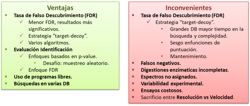 Los resultados falsos positivos, los falsos negativos y los espectros no asignados solo pueden resolverse mediante avances en la búsqueda de bases de datos y análisis bioinformático, es decir, software adicional que permita la identificación de péptidos que corresponden a espectros MS/MS no asignados previamente.