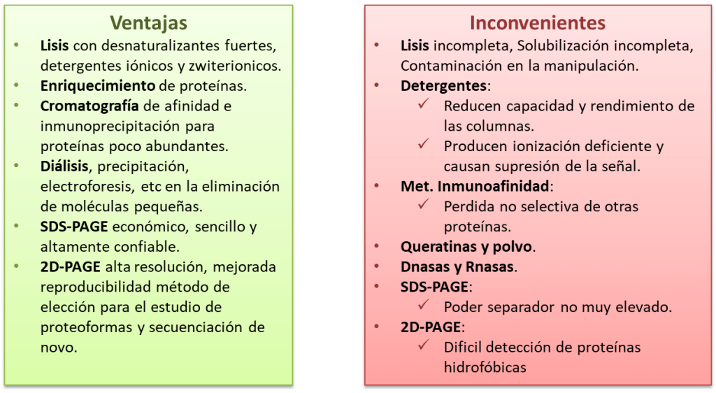 A diferencia de otras “ómicas”, en proteómica no se dispone de un tampón universal para aislar proteínas. Los grupos funcionales de las cadenas laterales de aminoácidos permiten una diversidad tan grande en términos de carga proteica e hidrofobicidad que hace que las propiedades fisicoquímicas entre proteínas sean muy diversas y lo más importante, su variedad en abundancia.