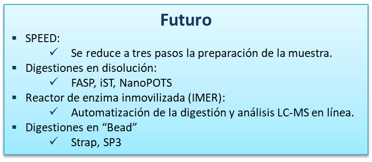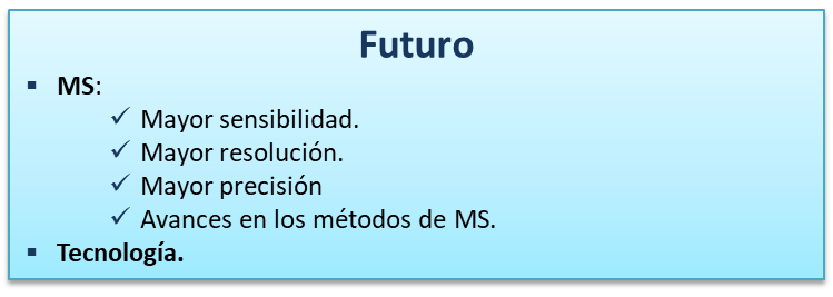 La MS y los métodos proteómicos han avanzado mucho en el campo del análisis de proteínas para la investigación fundamental y clínica. Existen métodos bien establecidos para la preparación de muestras y una excelente instrumentación para el análisis de MS. También hay una variedad diversa de motores de búsqueda de bases de datos. Sin embargo, el mayor desafío al que aún nos enfrentamos es una búsqueda completa y exhaustiva en bases de datos de un conjunto de antecedentes de proteómica. Está claro que lo que más necesita la proteómica es un soporte bioinformático mejor y más potente para realización de las búsquedas.