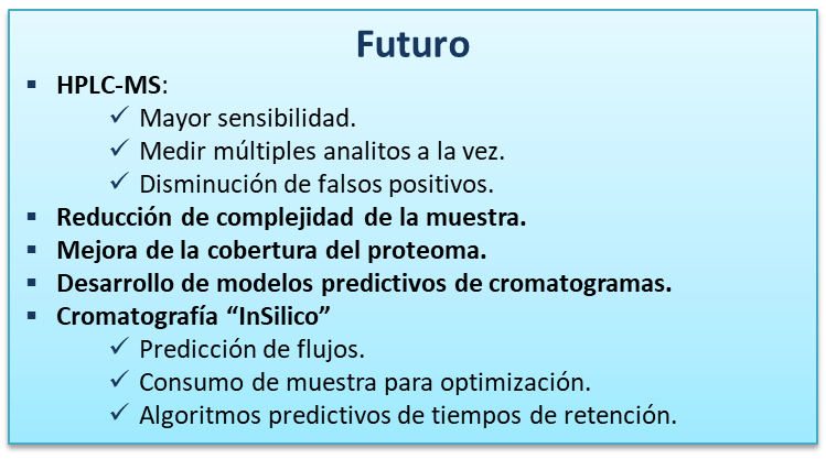 La metodología HPLC/UHPLC-MS seguirá siendo muy útil en las ciencias «ómicas» y se desarrollarán métodos de referencia, pero lo más deseable es la transición a diversas aplicaciones clínicas.