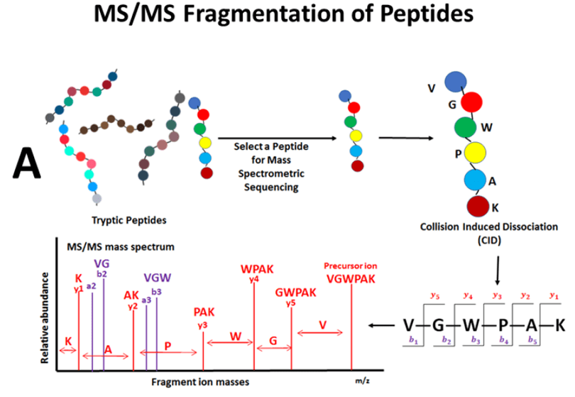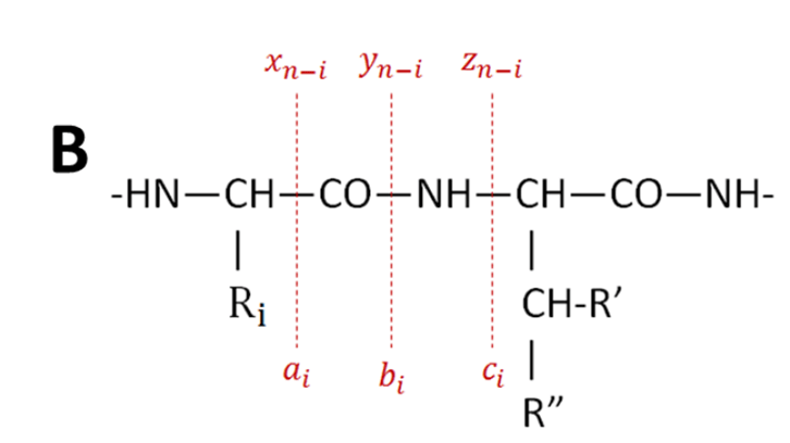 Fig. 2 Correspondencia entre la secuencia de aminoácidos del péptido y los picos de iones de fragmentos que se producen en MS/MS (A) y los principales iones fragmento teóricos que se producen a partir de la fragmentación de un péptido (B).