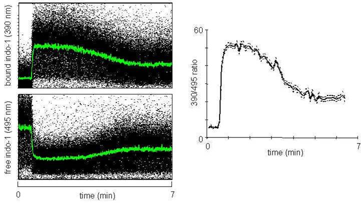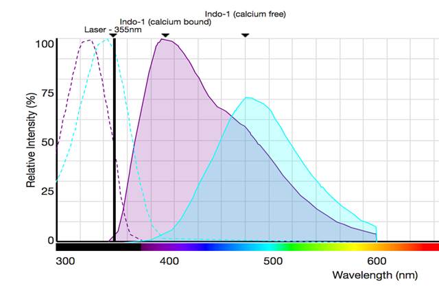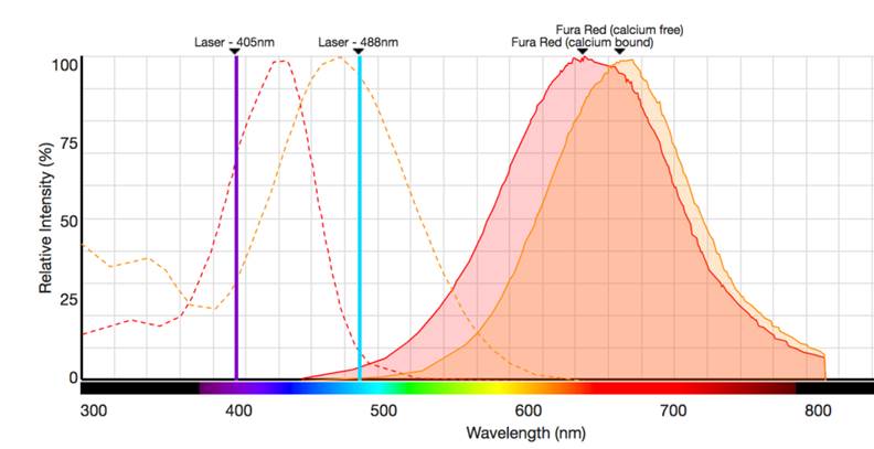 Las dos primeras sondas, Indo-1 y Fura Red, se usan típicamente para medir cambios en la concentración de calcio intracelular mediante la monitorización de la excitación o la emisión de dicha sonda ya que permiten realizar mediciones ratiométricas. Esto significa que podemos monitorizar el ratio calcio unido/no unido gracias a sus propiedades espectrales, ya que les permiten responder de manera diferente tanto al incremento del Ca2+ intracelular como a la disminución del mismo. Por ejemplo, la sonda Indo-1 que se excita con un láser UV, en ausencia de Ca2+ emite fluorescencia a 495 nm, y cuando tiene lugar un incremento en los niveles de Ca2+ intracelulares, deja de emitir a esa longitud de onda y comienza a emitir fluorescencia a 390 nm (ver figura 1). Haciendo el ratio entre las medidas de fluorescencia a ambas longitudes de onda, podemos monitorizar el incremento en los niveles de Ca2+ (ver figura 4).