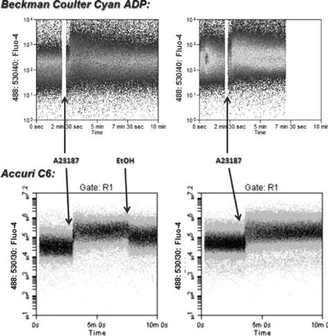 Figura 3. Comparación de las mediciones de Ca2+ usando dos tipos de citómetros. El citómetro Beckman Coulter Cyan APD requiere detener la adquisición para agregar el ionóforo A23187, de esta manera se pierden los datos de calcio de la respuesta inmediata. Sin embargo, Accuri C6 de Beckman Coulter, consta de un sistema de fluidos que trabaja mediante bombas peristáltica (al igual que el CytoFlex S) donde no es necesario interrumpir la adquisición de muestra, evitando así la pérdida de datos.