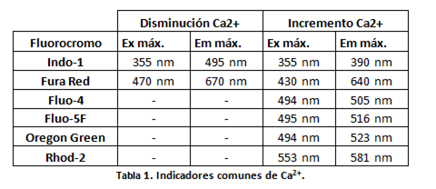 Existen varios compuestos capaces de emitir fluorescencia en respuesta a Ca2+ (incremento y disminución). Algunos ejemplos se muestran en la Tabla 1.