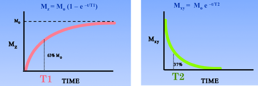 Fig. 1. Curvas de relajación T1 y T2 definidas por las ecuaciones de Bloch. EL T1 de cada tejido se define como el tiempo que tarda en recuperarse el 63% de la magnetización Mz y el T2 como el tiempo requerido para que la magnetización transversal caiga a aproximadamente el 37% de su valor inicial.