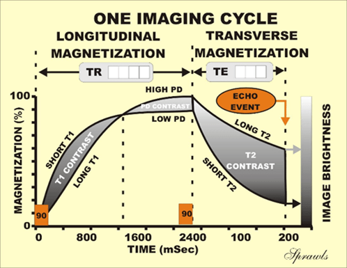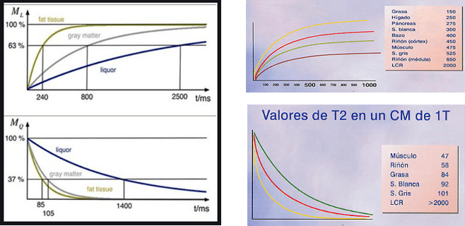Cuando queremos adquirir una imagen, tenemos que excitar los protones de nuestra muestra, en una región específica. Para ello, tendremos que aplicar un pulso de radiofrecuenca justamente en ese FOV, los protones que se encuentren en esa región determinada serán los que experimenten esa excitación. Después de esto, se producirá la relajación mediante este mecanismo, los protones volverán a su estado inicial. Bien por un proceso de relajación longitudinal (T1) y por una relajación transversal (T2). Existe un tercer parámetro que es el T2* que se relaciona con las inhomogeneidades en el campo magnético principal, que pueden ser el resultado de defectos intrínsecos en el propio imán o de las distorsiones de campo inducidas por susceptibilidad producidas por el tejido u otros materiales colocados dentro del campo. Estos procesos se producen bien por mecanismos de agitación térmica e internucleares. Sin entrar en muchos detalles de ecuaciones (Ecuaciones de Bloch) cada protón va a tener un valor de T1 y T2 en función del tejido (entorno) y del campo magnético en el que se encuentren, aunque para el T2 no se ve muy influenciado por este último.