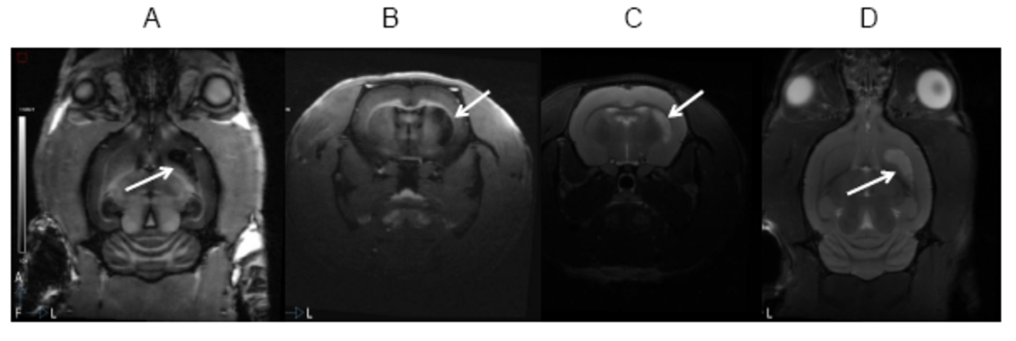 Fig. 3. A y B) corte coronal y axial potenciado en T1, C y D) corte axial y coronal potenciado en T2.
