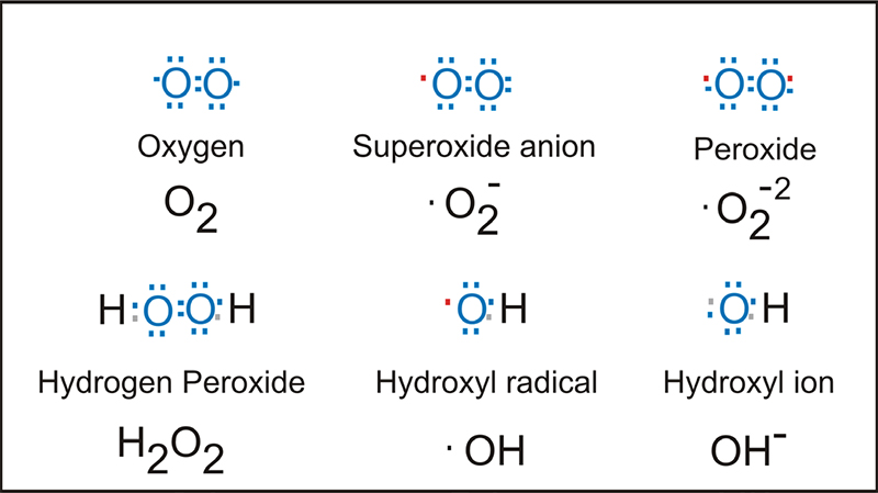 Las especies reactivas de oxígeno o ROS son moléculas muy pequeñas y altamente reactivas debido a la presencia de una capa de electrones de valencia no apareada (figura 1). Estas especies se forman de manera natural como subproducto del metabolismo normal del oxígeno, actuando como mensajero secundario de las células al igual que el calcio.