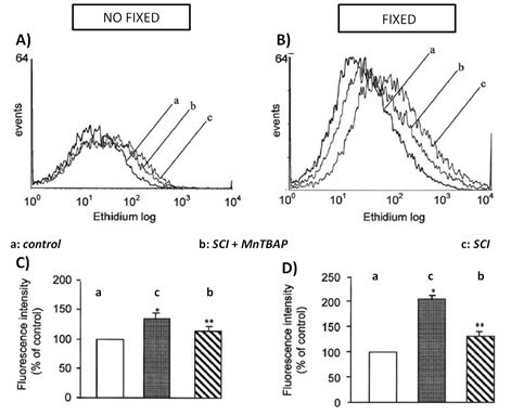 Figura 2. Comparativa de un protocolo sin fijación frente a otro en el que se fija la muestra para el análisis mediante citometría de flujo de O2– intracelular. Se compararon 3 grupos donde se observa en B) y D) una disminución en la oxidación de HE (ethidium) con el tratamiento de MnTBAP (b) respecto al control (a) y a la muestra SCI sin tratar (c). Figura modificada de Luo, J et al., 2002.