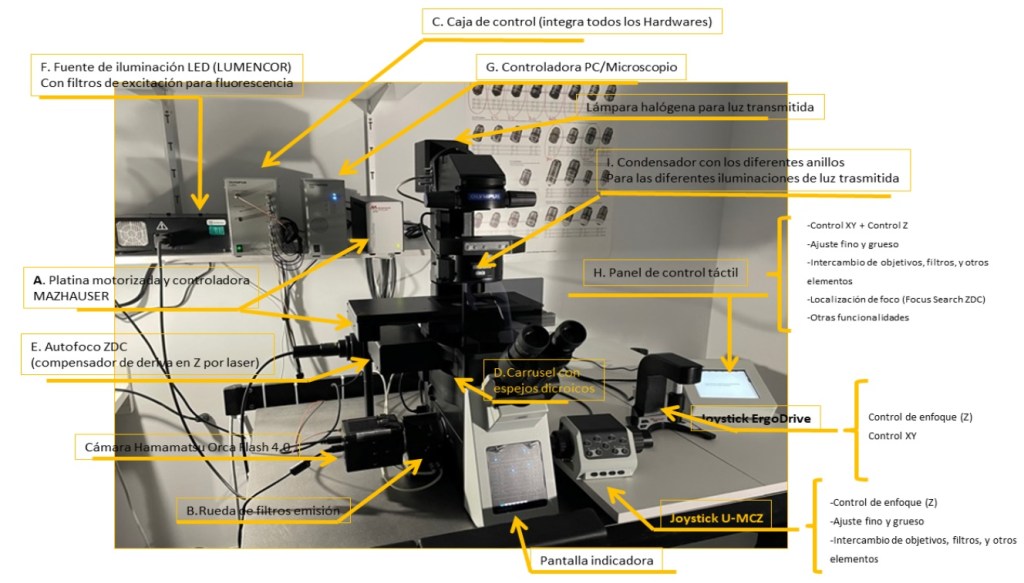 Figura 1. Microscopio IX83 de Olympus completamente robotizado y sus componentes.