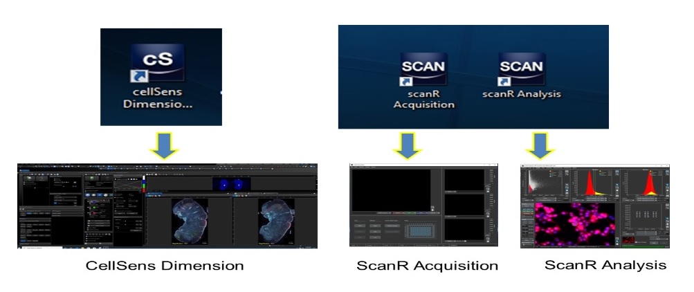 Una vez descritos los principales componentes del hardware es importante describir el software. Este microscopio lo hemos adquirido con dos softwares, el Cellsense y el ScanR, cada uno de ellos para unos propósitos concretos.