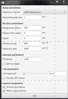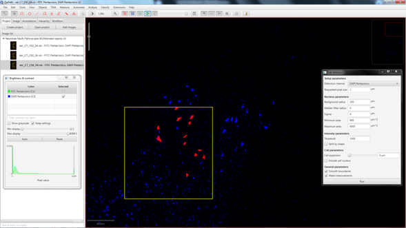 A continuación, desde Analyze>Cell detection>Cell detection (Figura 1) determinamos los parámetros que el programa va a utilizar para detectar nuestras células (motoneuronas). Aquí podemos indicar en qué canal hacer la detección (en este caso se llama «DAPI Pentacroico», aunque no es una tinción de DAPI la que estamos observando), la resolución a la que hacer la detección, el tamaño de los objetos (bajo Nucleus parameters, aunque en este caso los objetos que estamos detectando no son núcleos), la intensidad y otra serie de valores para ayudar a la detección.