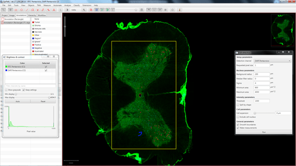 En la anterior newsletter vimos un ejemplo de cómo utilizar QuPath para navegar fácilmente por una imagen de gran tamaño de una sección de la médula espinal de un cerdo y seleccionar una región de interés (en este caso el asta ventral) que se exportó a la versión de ImageJ integrada en el programa para hacer una detección y medición de las neuronas presentes en esa región. Ahora vamos a ver cómo hacer una detección similar en la misma muestra usando únicamente QuPath y sin necesidad de limitarnos a una región pequeña.