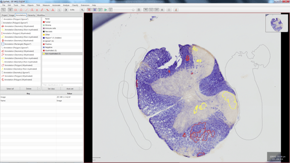 De nuevo, partiremos de un proyecto de QuPath en el que habremos metido las imágenes que queramos analizar. En nuestro ejemplo serán unas secciones de médula espinal de rata teñidas con eriocromo-cianina en las que queremos medir el área de tejido mielinizado y no mielinizado.