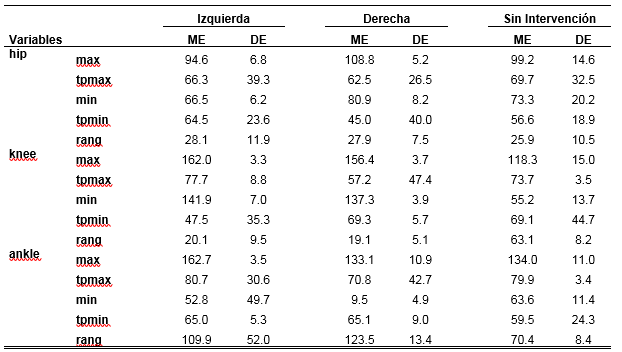 Tabla 2. Estadísticos de los recorridos articulares de los ciclos analizados