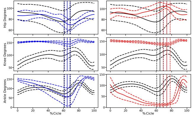 Línea continua: valor medio; línea discontinua: valor medio +/- desviación estándar; línea vertical: despegue de la pata; azul: lado izquierdo rata ejemplo; rojo: lado derecho rata ejemplo; negro: ratas sin intervención; valores ascendentes corresponden a movimientos de flexión.