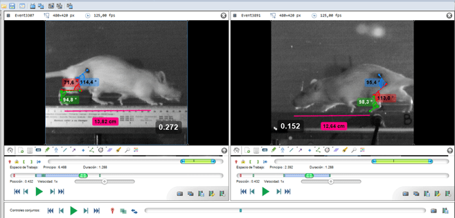 Previamente a la adquisición de los vídeos, la rata ejemplo (igual que las ratas que no han recibido ninguna intervención) se rasuró y con un rotulador de color negro se pintaron marcas en la cresta ilíaca, cadera, rodilla, tobillo, cabeza del 5º metatarsiano y cabeza del 5º metacarpiano, en ambos lados del animal. La rata pasó 6 veces por un pasillo de marcha de 1,5 m, del cual se analizaron 0,47 m de la parte central para eliminar los efectos de aceleración y frenado del animal. De los 6 recorridos se seccionaron 3 para su análisis. Los videos se registraron a 125 Hz.
