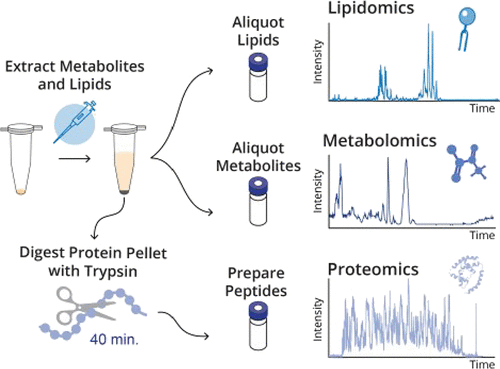 Existe una gran diversidad de metodologías de extracción porque los tejidos biológicos no son similares al considerar su estructura, textura, sensibilidades y contenido molecular. Extraer el material de interés sin perder parte del mismo es un desafío complejo. Por lo general, los metabolitos y los lípidos se extraen con los sistemas de disolventes bifásico Matyash (MTBE) o Folch/Bligh-Dyer (CHCl3/MeOH/Agua) que requieren de numerosos pasos de pipeteo cuidadosos, vórtices, incubaciones y centrifugaciones. La fracción proteica se lava, se seca y se re-solubiliza. Este último paso puede ser difícil y requiere sonicación u otros métodos que faciliten su disolución.