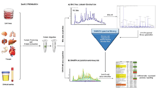 Para generar bibliotecas teóricas fiables que puedan utilizarse en experimentos SWATH, se han desarrolladoherramientas de aprendizaje profundo para el análisis SWATH, con el fin de mejorar la sensibilidad y especificidad de los datos generados por espectrómetros de masas Q-TOF.