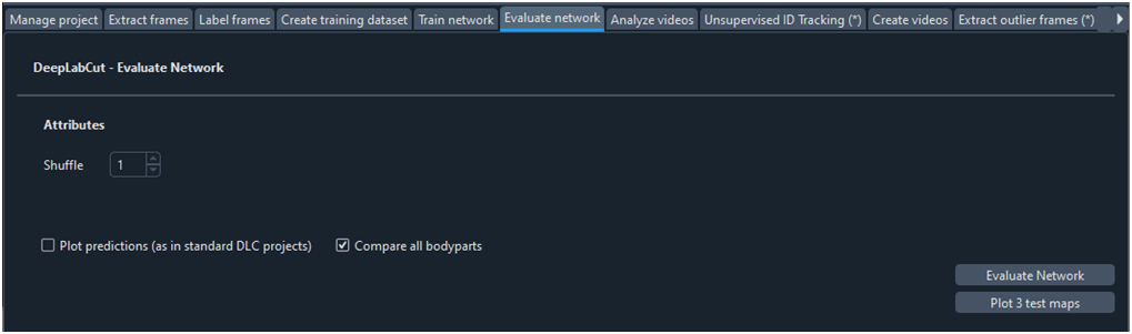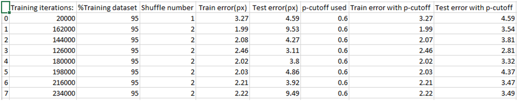 Es importante evaluar la bondad de la red entrenada. En este paso DLC aplica el modelo a todos los fotogramas, tanto a los de entrenamiento como a los de validación, y calcula el error y la probabilidad para ambos grupos.Al hacer clic sobre el botón ‘Evaluate Network’ de la ficha ‘Evaluatenetworw’ (Fig. 10) DLC crea la carpeta ‘evaluation-results’ dentro de la carpeta del proyecto. Esta carpeta contiene un archivo ‘.csv’ con los resultados de la evaluación (Fig. 11), si se selecciona la opción ‘Plotpredictions’ se genera una carpeta con los fotogramas de entrenamiento y de test en los que se muestran las etiquetas de entrenamiento y las estimadas por el modelo (Fig. 12).