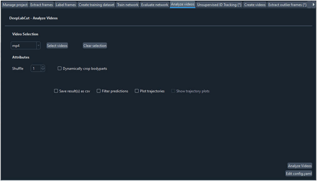 DLC permite seleccionar entre diferentes métodos para la obtención de los fotogramas. Se pueden obtener de manera manual o automática. Si el movimiento que estamos estudiando varía a lo largo del video sin ninguna dependencia temporal el algoritmo ‘uniform’ sería la opción adecuada, si el movimiento se concentra en una parte del video, por ejemplo el estudio de un agarre, la opción ‘kmeans’ sería más adecuada.