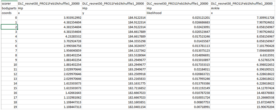 Para obtener las coordenadas xyde un vídeo o conjunto de vídeos hacemos uso de la ficha ‘Analyze videos’ (Fig. 13). Con esta función DCL aplica el modelo a cada fotograma del video en cuestión, calcula las coordenadas x e y en píxeles y la probabilidad de que el pixel estimado se encuentre donde se ha calculado. Al hacer clic sobre el botón ‘Analize Videos’ DLC crea en la carpeta donde se encuentra el video a analizar, además de otros archivos, un archivo ‘csv’ con los valores anteriormente comentados para cada fotograma y para cada etiqueta (o ‘bodyparts’ en config.yaml) (Fig. 14). Marcar la opción ‘Filterpredictions’ para obtener un archivo ‘csv’con los datos filtrados. La opción ‘Plottrajectories’ proporciona cuatro gráficos muy útiles para visualizar el análisis del video (Fig. 15, Fig. 16, Fig. 17 y Fig. 18).