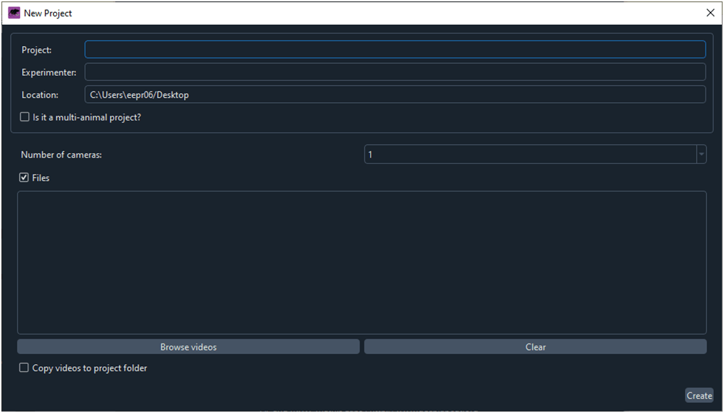 Introducimos el nombre del proyecto, del experimentador y de la ruta donde DLC creará una carpeta con el nuevo proyecto. Con el comando ‘Browse videos’ especificamos la carpeta donde se ubican los videos que vamos a utilizar para entrenar la red neuronal.