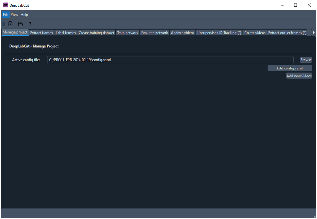 Fig. 4 Ventana principal de trabajo de DeepLabCut que muestra la ficha ‘Manage Project’