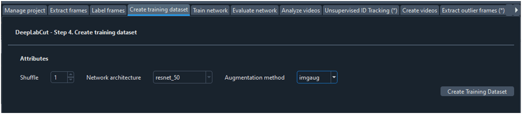 Para entrenar la red neuronal es necesario crear un conjunto de datos de entrenamiento. De todos los fotogramas etiquetados DLC toma un grupo para entrenar la red y otro grupo para validar el modelo, según ‘TrainingFraction’ en ‘config.yaml’. Podemos dejar la ficha ‘Create training dataset’ con la configuración por defecto (Fig. 8). El campo ‘Shuffle’ es para diferenciar entre modelos y poder compararlos. Con el parámetro ‘imgaug’ se expande artificialmente el conjunto de entrenamiento aplicando varias transformaciones a las imágenes (por ejemplo, rotación o cambio de escala) para generar modelos más robustos y precisos.
