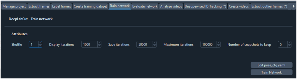‘TrainingFraction’: en general, un estándar admitido por la comunidad es utilizar el 70 % de datos para entrenar la red y el 30 % para validar el modelo, en este caso el valor a introducir sería 0.7. Si vamos a hacer una prueba con un reducido número de fotogramas sería mejor aumentar este parámetro, 0.95 es lo que DLC propone por defecto; esto lo deberíamos tener en cuenta a la hora de evaluar el modelo.