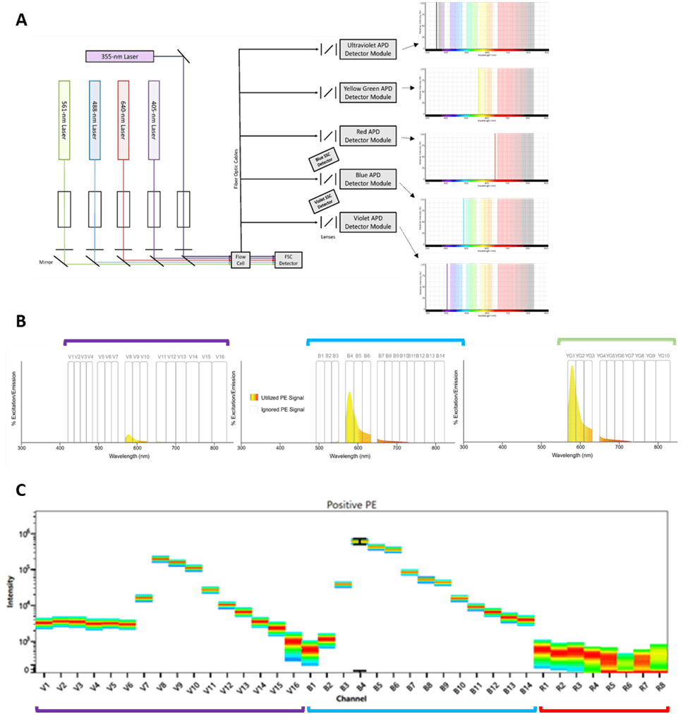 Fig. 2. Tecnología espectral. A, esquema del sistema de detectores de un citómetro espectral (Cytek) Espectro de excitación y emisión de la phycoeritrin (PE). B, detección del espectro de emisión de PE por los arrays de detectores. C, firma espectral de la PE