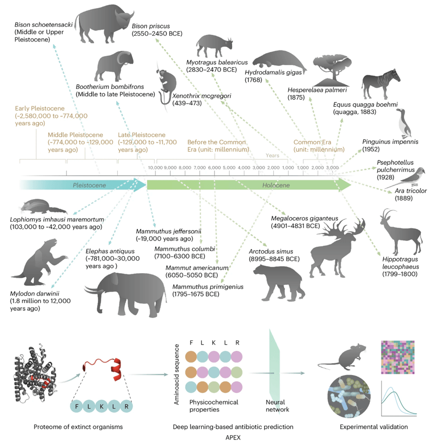 Una de las herramientas más importante del equipo es el uso de APEX (Antibiotic Peptide de-Extinction), un sistema de deep learning entrenado para predecir estos péptidos antimicrobianos a partir de proteínas ancestrales. Su rápido análisis masivo de secuencias le hace capaz de seleccionar aquellas con características estructurales y fisicoquímicas asociadas a la actividad antimicrobiana en tiempo récord.