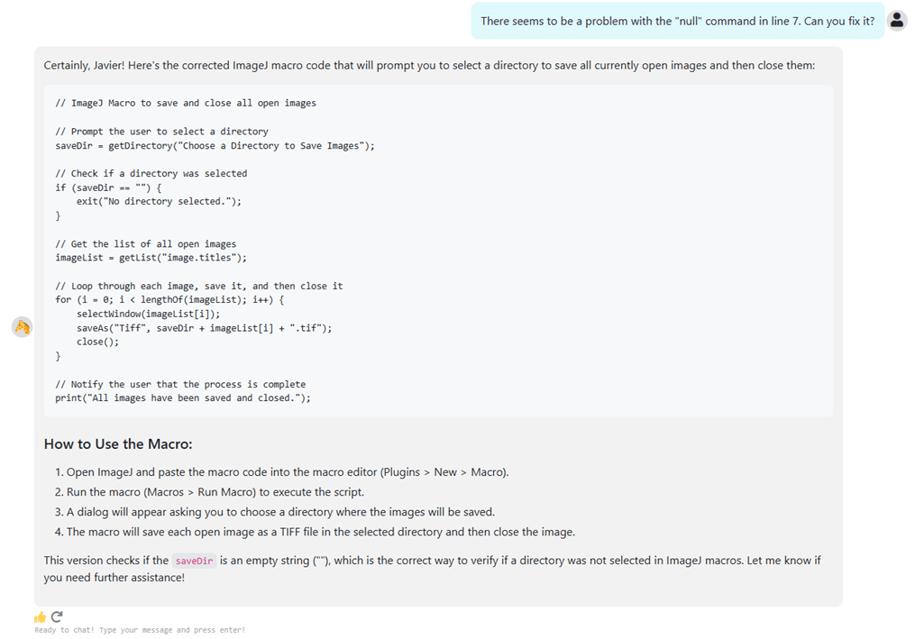 - Scripts de ImageJ (Macro): Un usuario podría pedir: «Genera un script de ImageJ para abrir una carpeta de imágenes TIFF, convertirlas a 8 bits y guardarlas como PNG.» El chatbot podría generar el código de macro de ImageJ directamente.