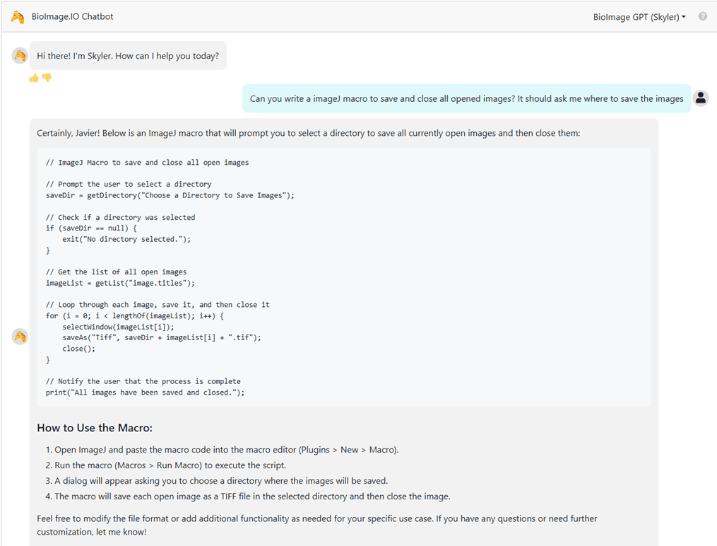 También hay una versión accesible directamente desde chatGPT. Por defecto, el asistente que sale es Melman, pero puedes preguntar a los demás poniendo una arroba antes de su nombre (p.ej.: @Skyler, can you write an imageJ macro to save and close all opened images?)